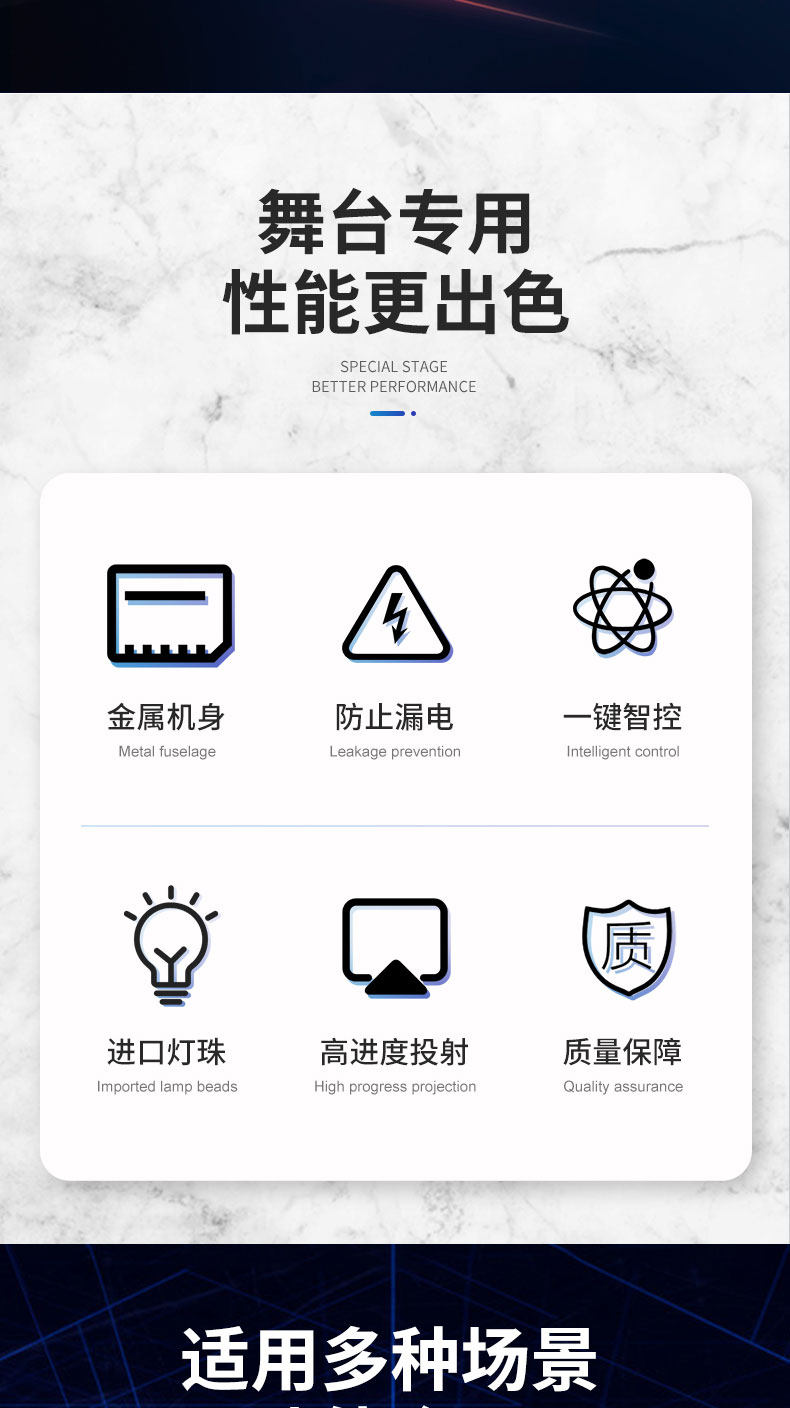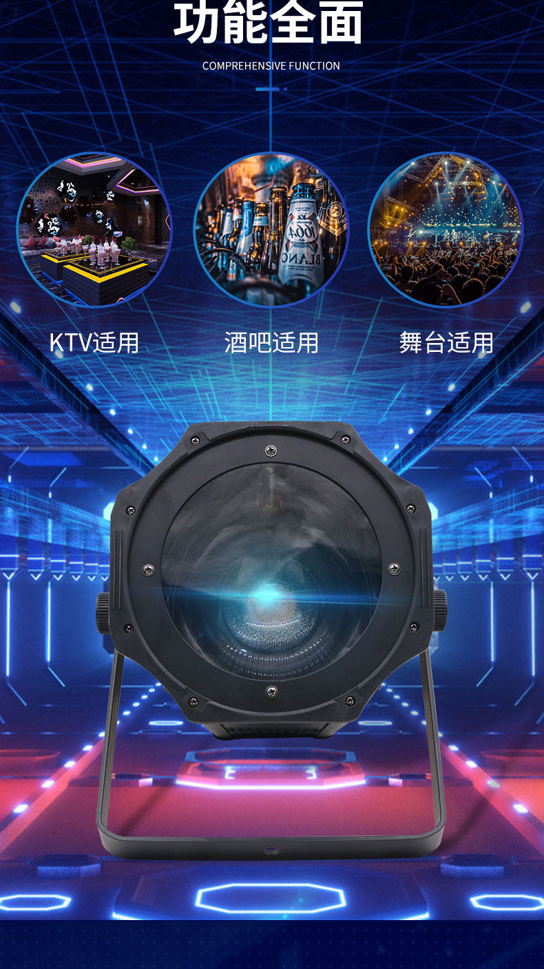 應用于舞臺的照明、背景染色、大型文藝演出、體育館照明、城市燈光系統、電視臺、會議中心、專業劇院、公園、歌舞廳、酒吧、小型文藝演出?