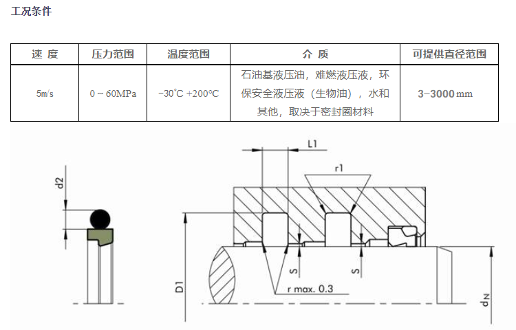 | 1.5m/s | 0~35Mpa | -30~200℃ | 石油基液壓油,難燃液壓液,環(huán)保安全液壓液(生物油),水和其他,取決于密封圈材料 | 3~3000mm |
