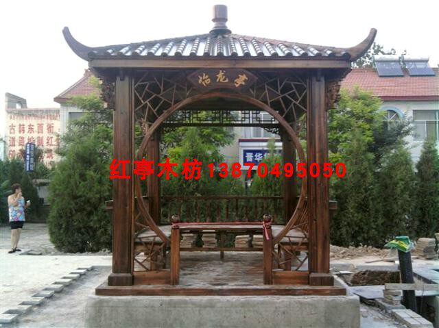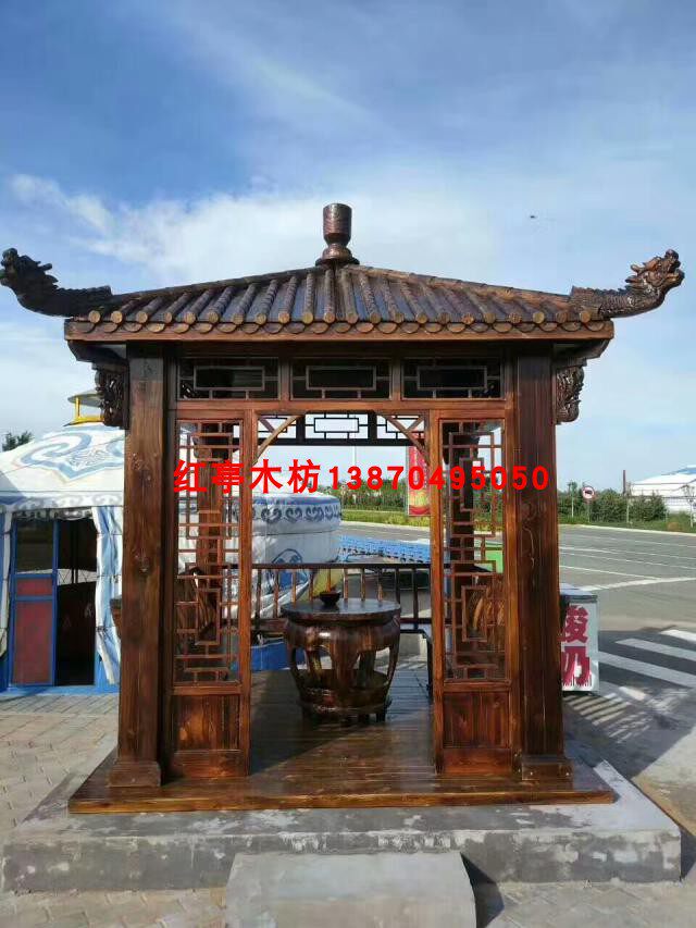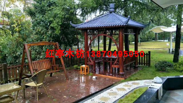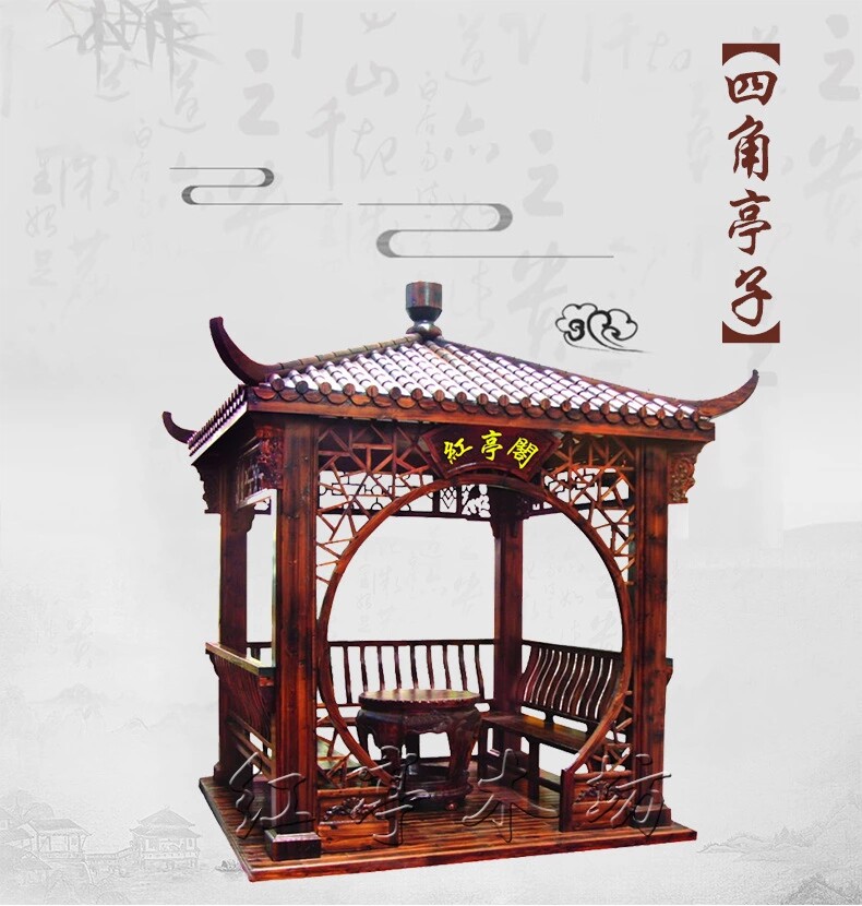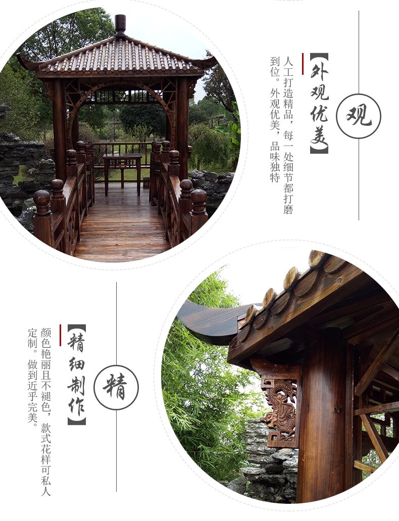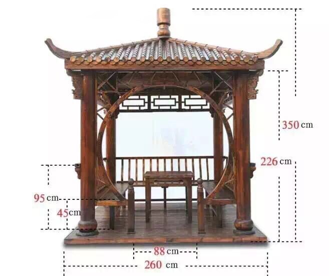 【瓦頂】:本公司產(chǎn)品瓦頂設(shè)計(jì)為古典宮殿式竹節(jié)瓦,三層防水(分別為頂部一層竹節(jié)瓦,中間一層防雨層,最下面一層無縫實(shí)木木板和支撐梁架),保證雨天下雨不漏水,材料均采用多年以上香杉木制造。