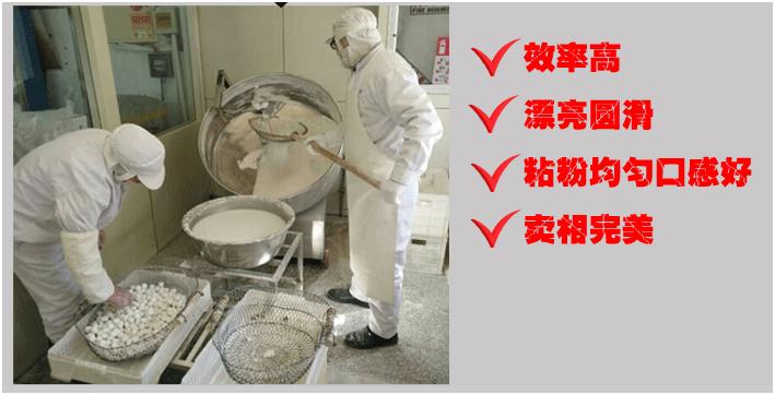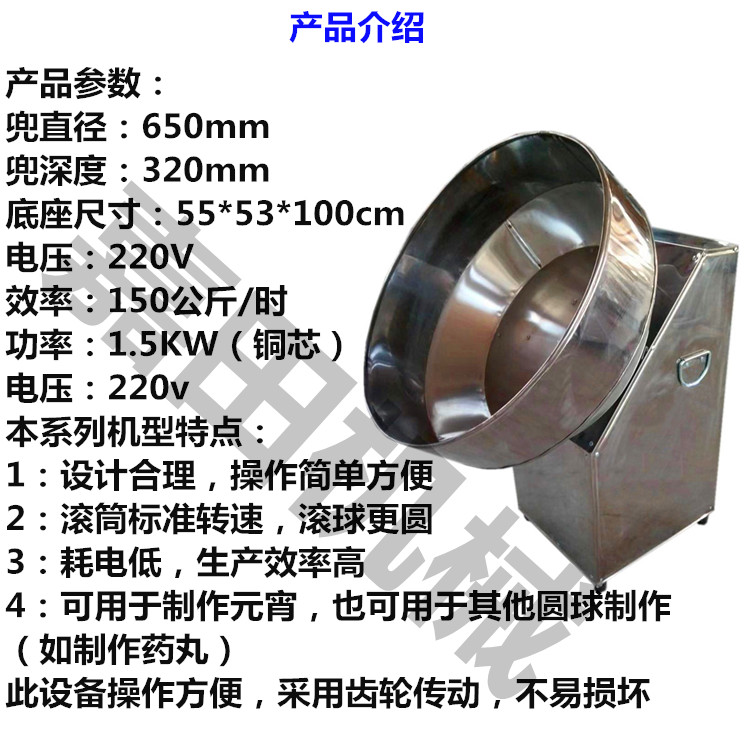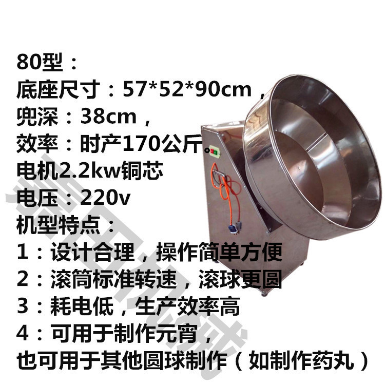 工具,一個水盆2個篩子,把粉放在機器大盆里,事先做好的四方元宵餡子放在**個篩子里面浸水,再放入機器里面旋轉等到包衣上不去了,用第二個篩子把元宵撈出來回晃晃把表面蓬松的面粉晃去、在放到**個篩子里浸水在放到機器里面旋轉。反反復復、直到旋轉合適的大小為止。