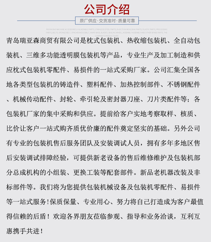 售后服務:我公司承諾凡是本公司的包裝機械設備一律保證由瑞亞森專業售后服務人員免費上門安裝調試,免費培訓設備操作工人,同時一年內設備出現非人為造成的故障,全部公司負責維修維護,保證客戶的正常生產。設備使用期間終身提供免費的技術支持故障咨詢指導等。
