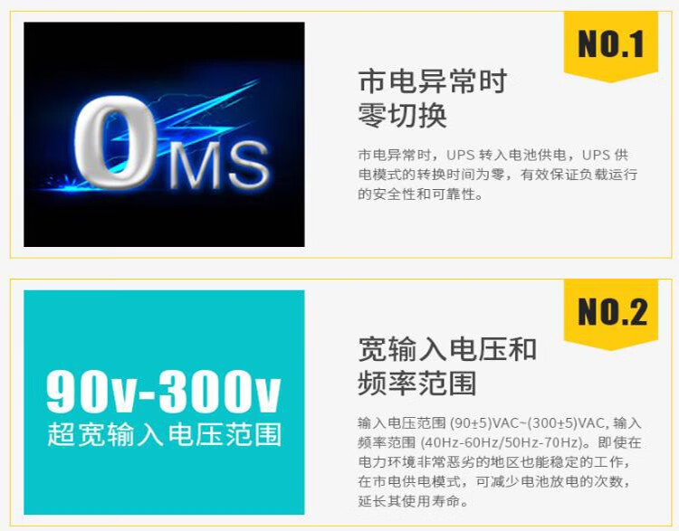 市電異常時,UPS轉入電池供電,UPS供電模式的轉換時間為零,有效保證負載運行的安全性和可靠性。