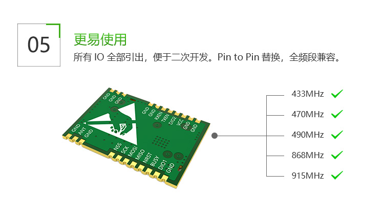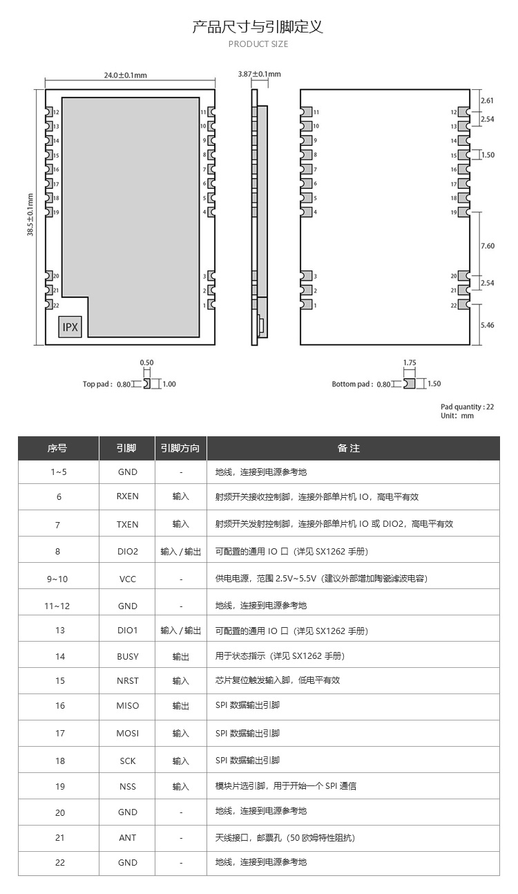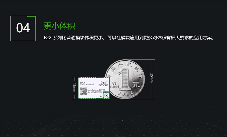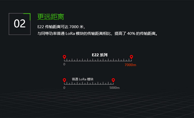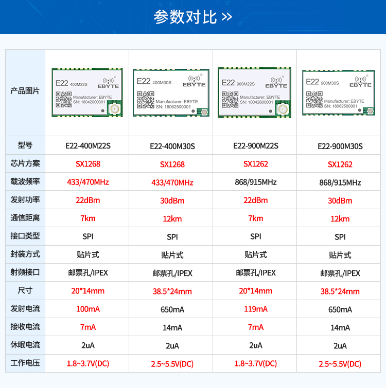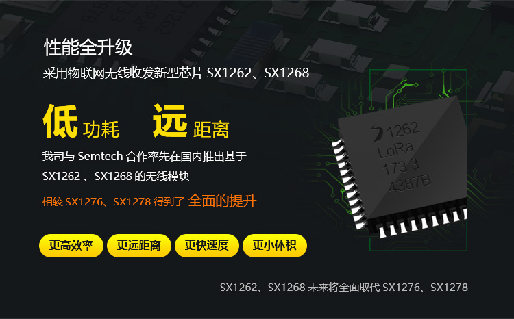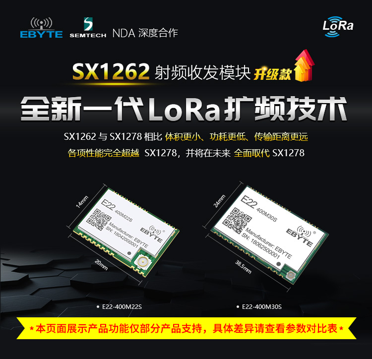 產品簡介:E22系列產品是國內率先采用Semtech公司的SX1262、SX1268射頻芯片的無線模塊,此芯片提供了多種調制方式,同時SX126x射頻芯片,具備兩種配電方式,低壓差穩壓器(LDO)以及高效率降壓DC-DC轉換器,在選擇DC-DC方式的前提下,接收電流極低,真正意義上實現了低功耗。