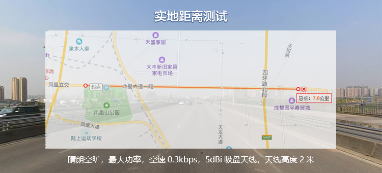 | 實測距離 | 7000米 | 晴朗空曠環境,*大功率,天線增益5dBi,高度2m |