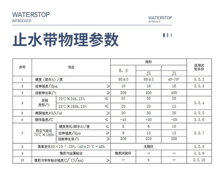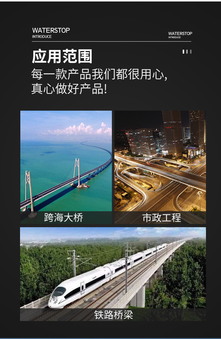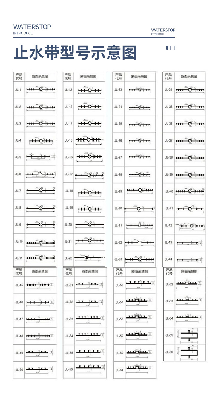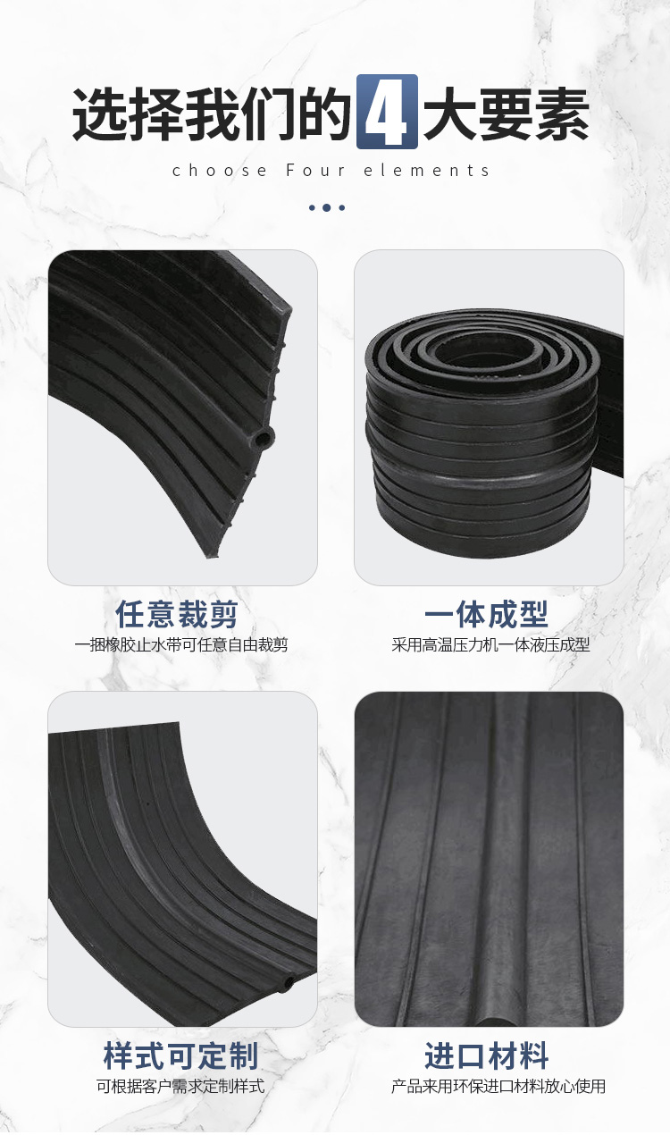 適用范圍橡膠止水帶主要用于混凝土現澆時設在施工縫及變形縫內與混凝土結構成為一體的基礎工程,如地下設施、隧道涵洞、輸水渡槽、攔水壩、貯液構筑物等。