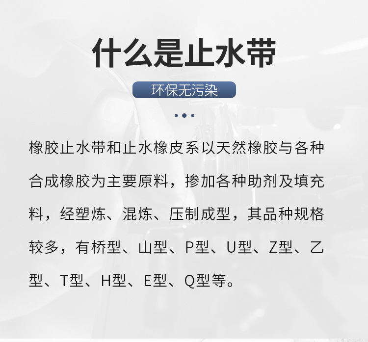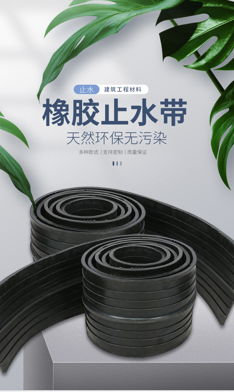 橡膠止水帶和止水橡皮系以天然橡膠與各種合成橡膠為主要原料,摻加各種助劑及填充料,經塑煉、混煉、壓制成型,其品種規格較多,有橋型、山型、P型、U型、Z型、乙型、T型、H型、E型、Q型等。根據使用情況又可分類為埋式橡膠止水帶和背貼式橡膠止水帶。該止水材料具有良好的彈性,耐磨性、耐老化性和抗撕裂性能,適應變形能力強、防水性能好,溫度使用范圍為-45℃-+60℃.當溫度超過70℃,以及橡膠止水帶受強烈的氧化作用或受油類等有機溶劑侵蝕時,均不得使用橡膠止水帶。一般常在地下室外墻和后澆帶施工時使用。