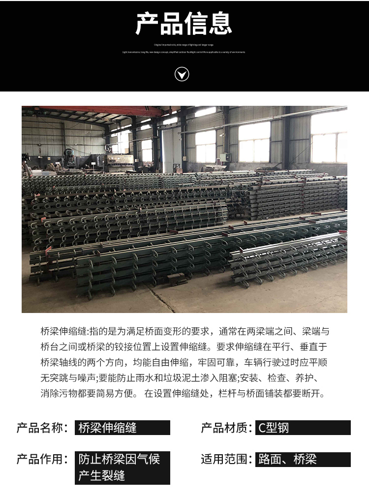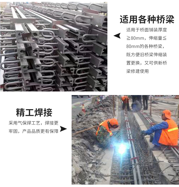 橋梁伸縮縫指的是為滿足橋面變形的要求,通常在兩梁端之間、梁端與橋臺之間或橋梁的鉸接位置上設置伸縮縫。要求伸縮縫在平行、垂直于橋梁軸線的兩個方向,均能自由伸縮,牢固可靠,車輛行駛過時應平順、無突跳與噪聲;要能防止雨水和垃圾泥土滲入阻塞;安裝、檢查、養護、消除污物都要簡易方便。 在設置伸縮縫處,欄桿與橋面鋪裝都要斷開。橋梁伸縮縫的作用:在于調節由車輛荷載和橋梁建筑材料所引起的上部結構之間的位移和聯結。斜交橋的伸縮裝置一旦被破壞,將嚴重影響行車的速度、舒適性與安全,甚至造成行車安全事故。