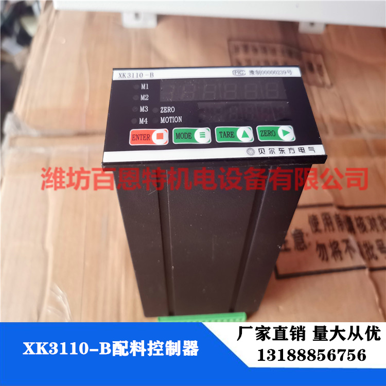 XK3110-B高速稱重配料控制器主要是為各種配料系統設計,用于提高配料精度及配料過程自動化程度的控制儀表。XK3110-B高速稱重配料控制器采用先進的、高集成度的微處理器及集成電路,技術**,工藝優良,性能可靠,具有很高的控制精度和很好的抗干擾能力;采用先進的SMT技術,體積小巧,集成度高;內置隔離的RS232及RS485通訊接口實現多點或遠距離通訊;內置隔離的高精度DA轉換器、可以輸出的4~20mA模擬量,用于實現重量信號變松輸入,全數字方式的調控方式,操作更簡單。【XK3110-B高速稱重配料控制器】產品參數品牌:貝爾東方電氣產品型號:XK3110-B測量范圍:30噸以下測量精度:3級顯示方式:數碼外形尺寸:96mm(寬)*48mm(高)*156mm(深)開孔尺寸:92mm(寬)*44mm(高)工作環境:0~50℃【XK3110-B高速稱重配料控制器】技術規格電源:220V±15%、50Hz或110V±15%、60Hz;功耗:6W;量程范圍:500~30000;分度間距:1、2、5、10、20、50;傳感器激勵電壓:直流9V±5%或5V±5%(**B2A型),*大負載能力150mA;輸出方式:開集極輸出,*高直流24V,0.3A;通訊方式:串行EIA-RS232/RS485標準;模擬量輸出方式:0~24mA可調節、16位分辨率、*大負載電阻500Ω。【XK3110-B高速稱重配料控制器】功能簡介集稱重顯示器與配料控制器為一體;雙顯示器同時顯示毛重和凈重;*小型的配料控制器,其面板尺寸僅為96mm*48mm;*多可控制四種不同種類的物料;所有預置數據都具有斷電保護功能;自動零位跟蹤;按鍵去皮功能;所有物料具有各自的粗計量、精計量和落差補償;具有軟件全數字式調校功能;可選RS485為標準串行輸入輸出口;通訊RS485可實現多點通訊;通過RS232/RS485輸出配料資料;顯示精度*高達1/15000;檢驗超差以及超差輸出;具有卸料控制功能;啟動生產條件可以通過菜單設定;生產去皮條件可以通過菜單設定;具有上電自動歸零功能;配料完成后,具有凈重顯示保持功能;可設定落差*高范圍,確保自動補償功能不因機械故障而造成錯誤;慢速配料延遲時間可通過菜單設定;比較次數可通過菜單設定,保證不因稱體沖擊造成錯誤控制;啟動去皮延遲時間可通過菜單設定;去皮檢測次數可通過菜單設定,以免在不穩定的情況下造成去皮錯誤;快速及慢速配料的禁止比較時間可單獨設置;具有雙重數字濾波;配量低于寬容度時,可作添量配料;可以通過菜單設定校稱參數;可以單獨進行校零、校稱量間距操作;4~20mA高精度模擬量輸出;輸入口可選擇有源、無源兩種方式(出廠指定)。