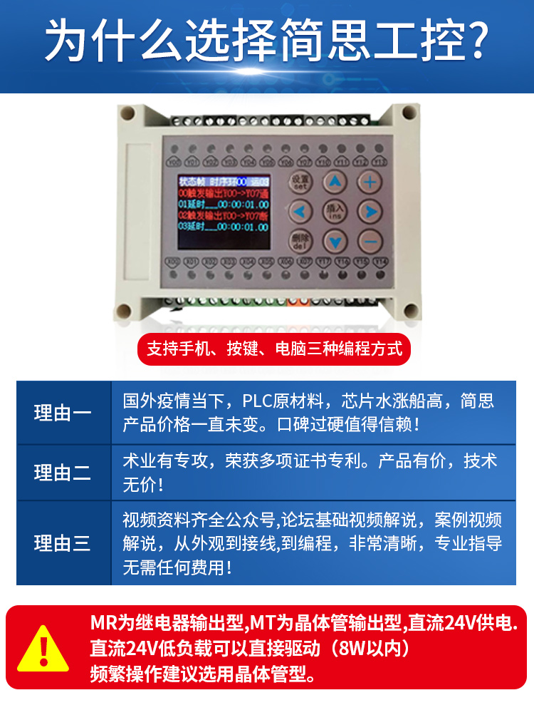 MR為繼電器輸出型,MT為晶體管輸出型,直流24V供電,直流24V低負載可以直接驅動(8W以內),頻繁操作建議選用晶體管型。