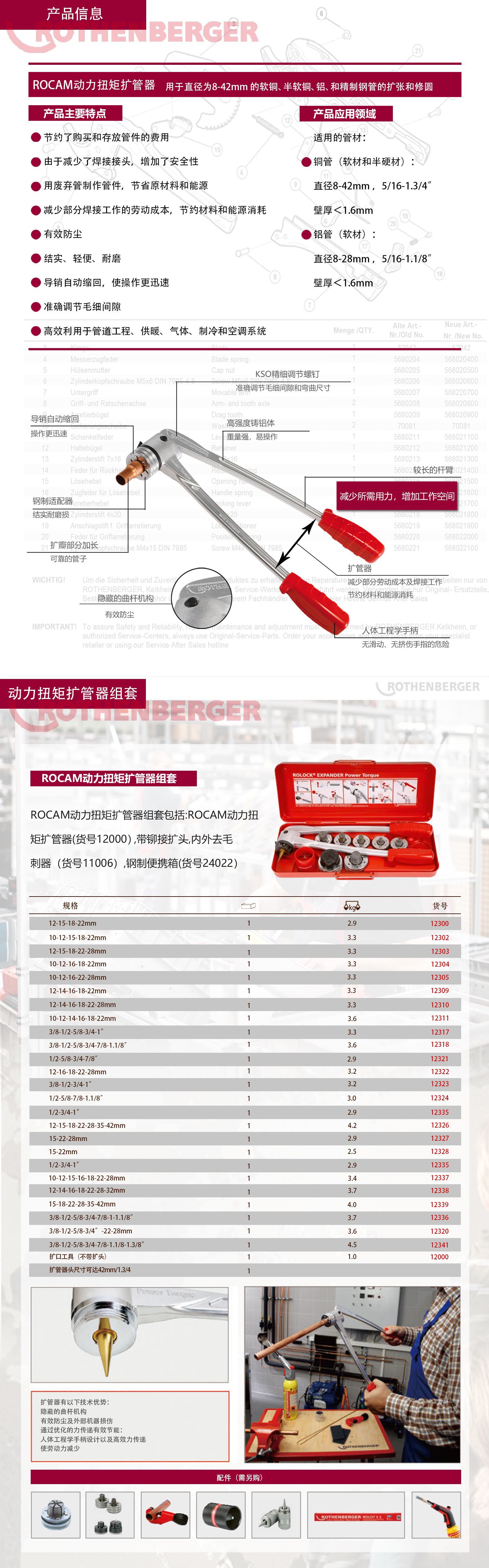 ROCAM動力扭矩擴管器組套包括:ROCAM動力扭矩擴管器(貨號12000),帶鉚接擴頭,內外去毛刺器(貨號11006),鋼制便攜箱(貨號24022)