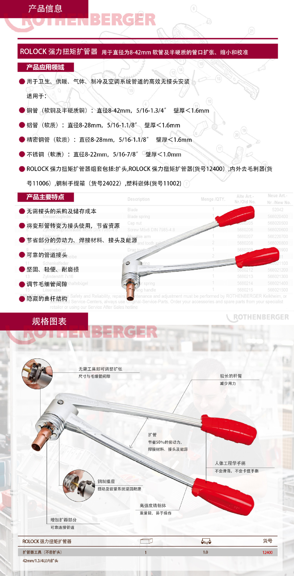 強力扭矩擴管器組套包括:擴頭, 強力扭矩擴管器(貨號12400),內外去毛刺器(貨號11006),鋼制手提箱(貨號24022),塑料嵌體(貨號11002)