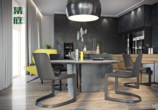 家具樣式摒棄浮華與繁瑣,石材與金屬互為搭配,洗練的線條,纖巧精美的樣式,將生活形態(tài)和美學(xué)意識(shí)轉(zhuǎn)化成一種無聲卻可感知享受的設(shè)計(jì)語言。 餐廳、庭院、書房、茶室,四者之間利用隔斷模糊界限,配上綠植與飾品,空間相互借景;室內(nèi)室外水乳交融,讓用餐、品茶、讀書仿佛置身于大自然,給高壓快節(jié)奏的城市生活增添了一抹綠意。