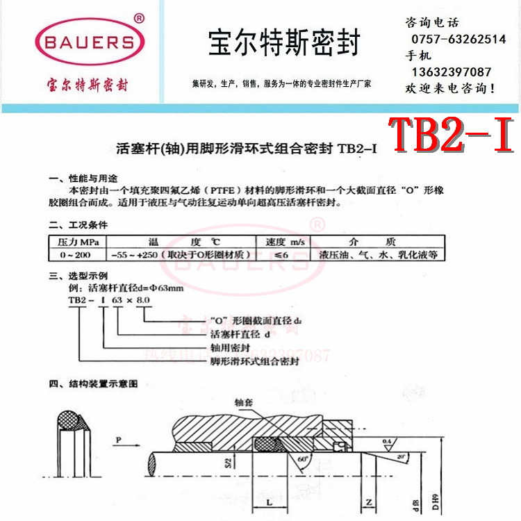 TB2-I密封由一個填充聚四氟乙烯(PTFE)材料的腳形滑環和一個大截面直徑 “O” 形橡膠圈組合而成。適用于液壓與氣動往復運動單向超高壓活塞桿密封。