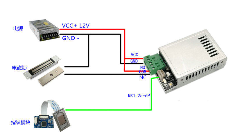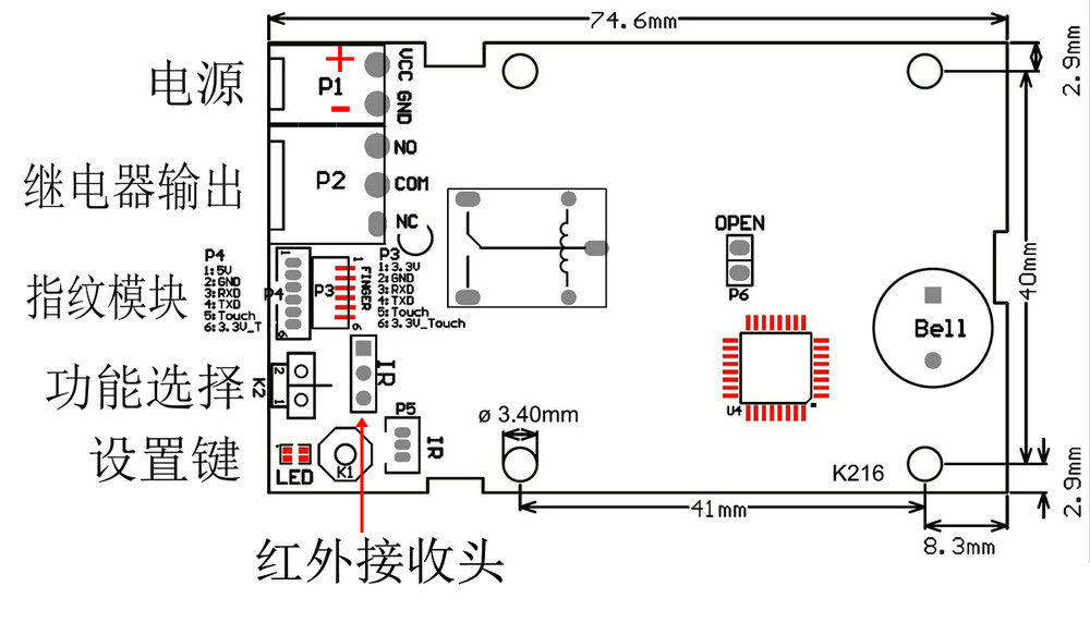 3. 使用:當功能設置選擇2時,指紋通過后,繼電器閉合5秒(默認);當選擇1時,指紋通過后繼電器閉合,等手指拿開繼電器同時釋放。