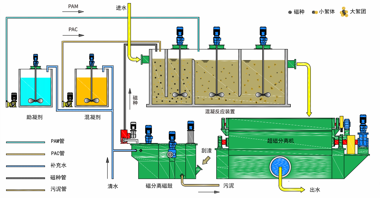 ●含有一定濃度磁性物質(zhì)的污水,在混凝劑和助凝劑作用下,磁性物質(zhì)與非磁性懸浮物進(jìn)行混凝反應(yīng),形成微磁絮團(tuán);