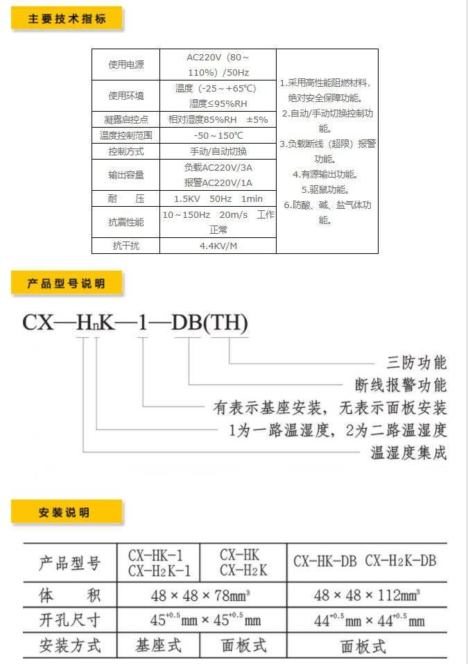此產品解決了客戶產品安裝的問題,將溫濕度傳感器和電路用一定的技術進行集成,從而達到溫濕度的同時控制功能,CX-HK產品是高性能、高科技含量的產品。