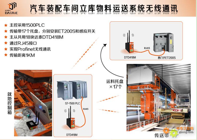 比亞迪某廠區(qū)裝配車間的物料傳送帶上有17個(gè)托盤,每個(gè)托盤分別裝有一塊ET200S西門子I/O模塊及傳感器。由于傳送帶運(yùn)送物料為持續(xù)移動(dòng)裝置,不方便布線,因此在控制柜S7-1500 PLC及17個(gè)托盤的ET200S西門子I/O模塊端分別安裝一塊達(dá)泰DTD418MB西門子PLC無(wú)線通訊終端,即可以實(shí)現(xiàn)控制柜與17個(gè)托盤之間物料運(yùn)送信息無(wú)線傳輸,完成控制柜內(nèi)S7-1500 PLC與傳送帶托盤ET200S的無(wú)線數(shù)據(jù)交互工作。