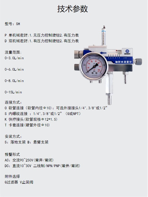 軸封水流量計斷流保護軸封冷卻水是用來監測和調節軸封裝置內水的流量和壓力,用于保護軸封的穩定運行。適用于有軸封裝置(包括機械軸封和填料)的設備,如:泵,混合器,網,拌器等,同時可依據儀表的讀數判斷軸封的運行狀況及相關問題,如泄露或堵塞,從而維護設備的正常運行。
