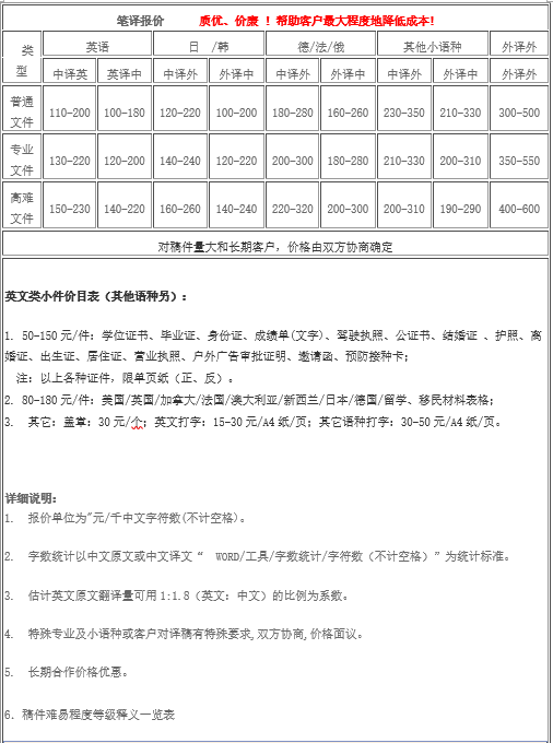 筆譯服務價格: